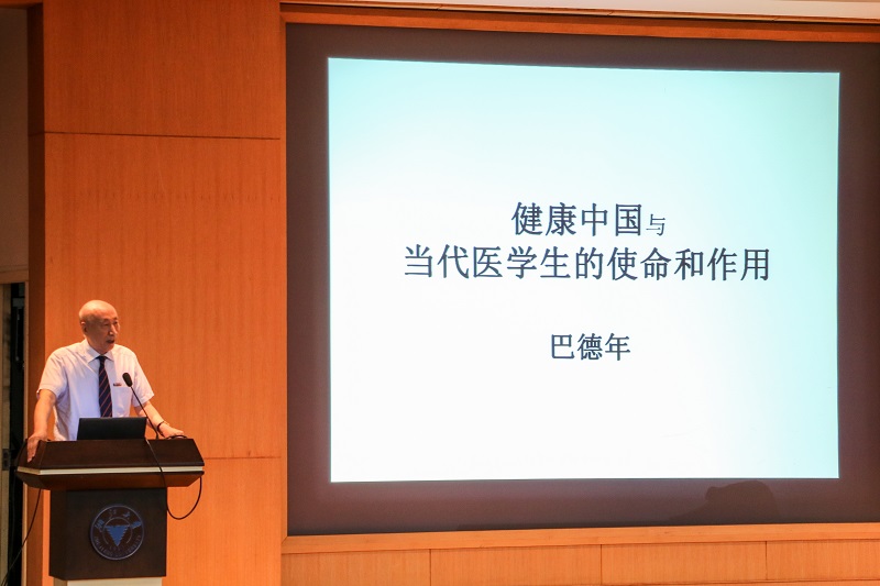 接着,巴德年院士为新生们上了医学生的第一堂课。主讲内容是“健康中国与当代医学生的使命和作用”。他首先对学生们的到来表示欢迎与祝贺,接着详细描述了健康中国的基本内涵和规划图景。提出了“健康中国2030”这一建设性目标。之后,他提出了全科医生的前景与可能性,希望学校多出几个优秀的全科医生,并坚信全科是医学服务的主战场,希望全科医师能够与健康指导师顺利合作。他提出医学的本质,认为医学不仅是关于疾病的科学,更应该是关于健康的科学,医学任务不仅是防病治病,更重要的是改善人们的生活质量,提高人们的健康水平。最后,他对每一名新生提出了殷切期望,希望大家养成人文心,练就科学脑,拥有全面正确的世界观,以及一个温暖而勤劳的手,成为一名真正优秀的人才。他提醒新生们到了大学会有更多的自我学习和研究机会,而这之间能够迅速转化并适应的人,才更有可能成为佼佼者。