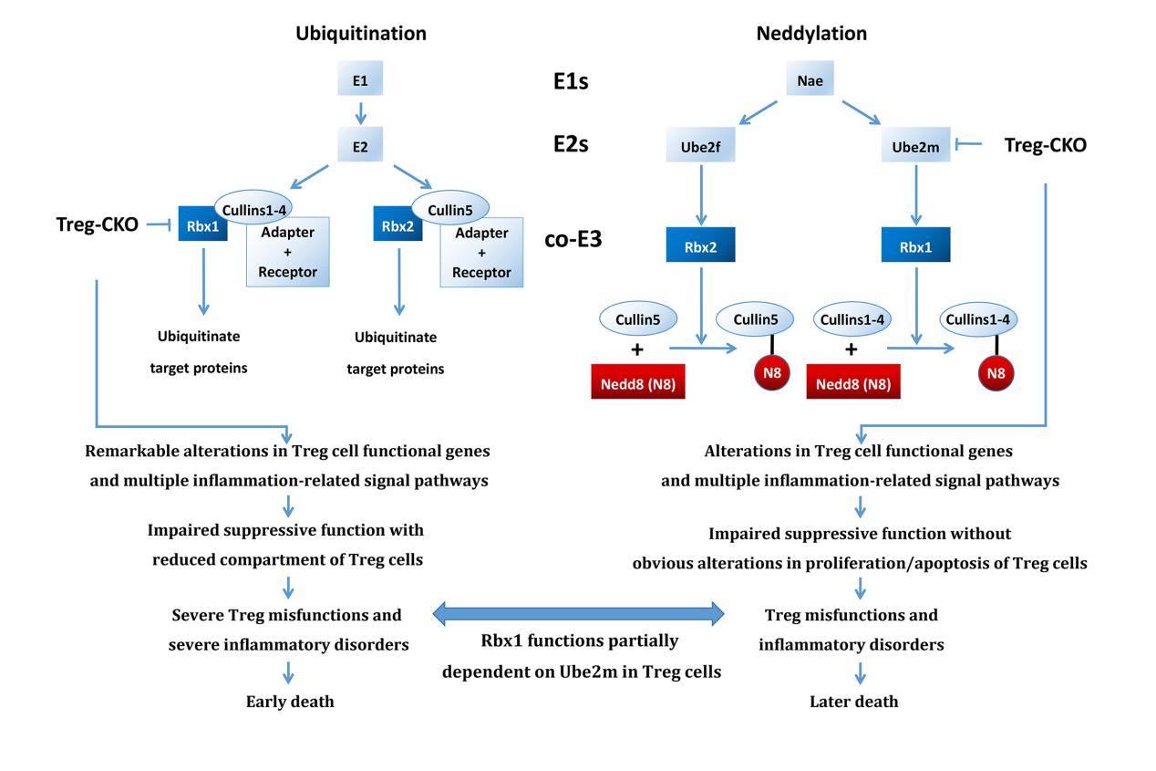 蛋白质拟素化是一种类泛素化修饰,由类似于泛素化的E1-E2-E3酶促级联反应催化完成;拟素化修饰对于CRLs的活性非常重要,其中拟素化E2耦联酶Ube2mRbx1的上游,拟素化E2耦联酶Ube2fSag的上游8。在Treg细胞中敲除Ube2f,小鼠没有明显的炎症反应,和敲除Sag相似。令人惊奇的是,在Treg细胞中敲除Ube2m,引发的表型要远远弱于Rbx1缺失引发的,表明在Treg细胞中,Rbx1的功能只是部分依赖于Ube2m,与经典观点不同,暗示了Ube2m-Rbx1调控的复杂性。