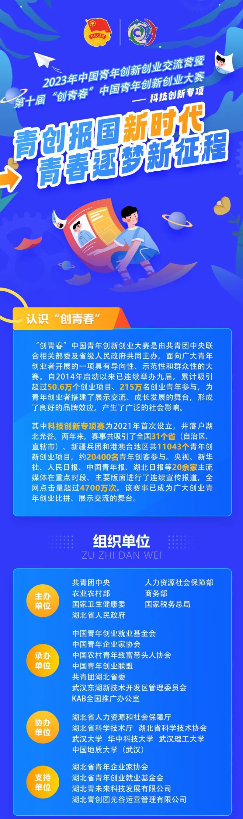 现开展第十届“创青春”中国青年创新创业大赛(科技创新专项)的推荐报名工作,赛事详细信息请参考下图。