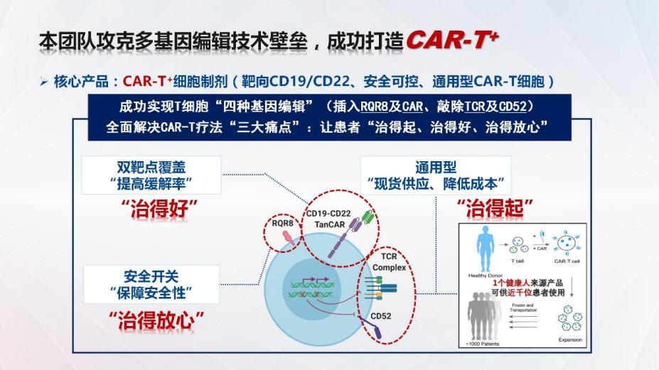 本团队针对现实难题,设计的通用型CAR-T细胞,靶向多个位点,提高CAR-T细胞治疗疗效,降低CAR-T产品毒副反应,降低产品制备成本,有望能使更多有需要的患者承担得起治疗。