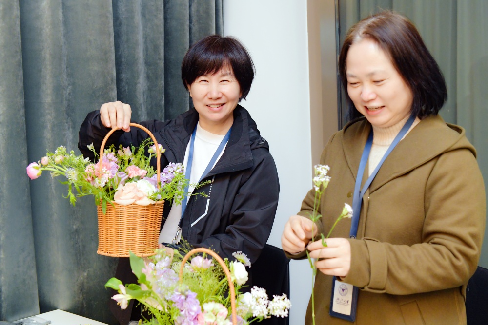 通过插花艺术体验,教职工们在花的世界里消解了疲乏,收获了快乐。在今后的工作中,她们将以更加饱满的热情和积极的心态,投入到学院的各项事业建设。